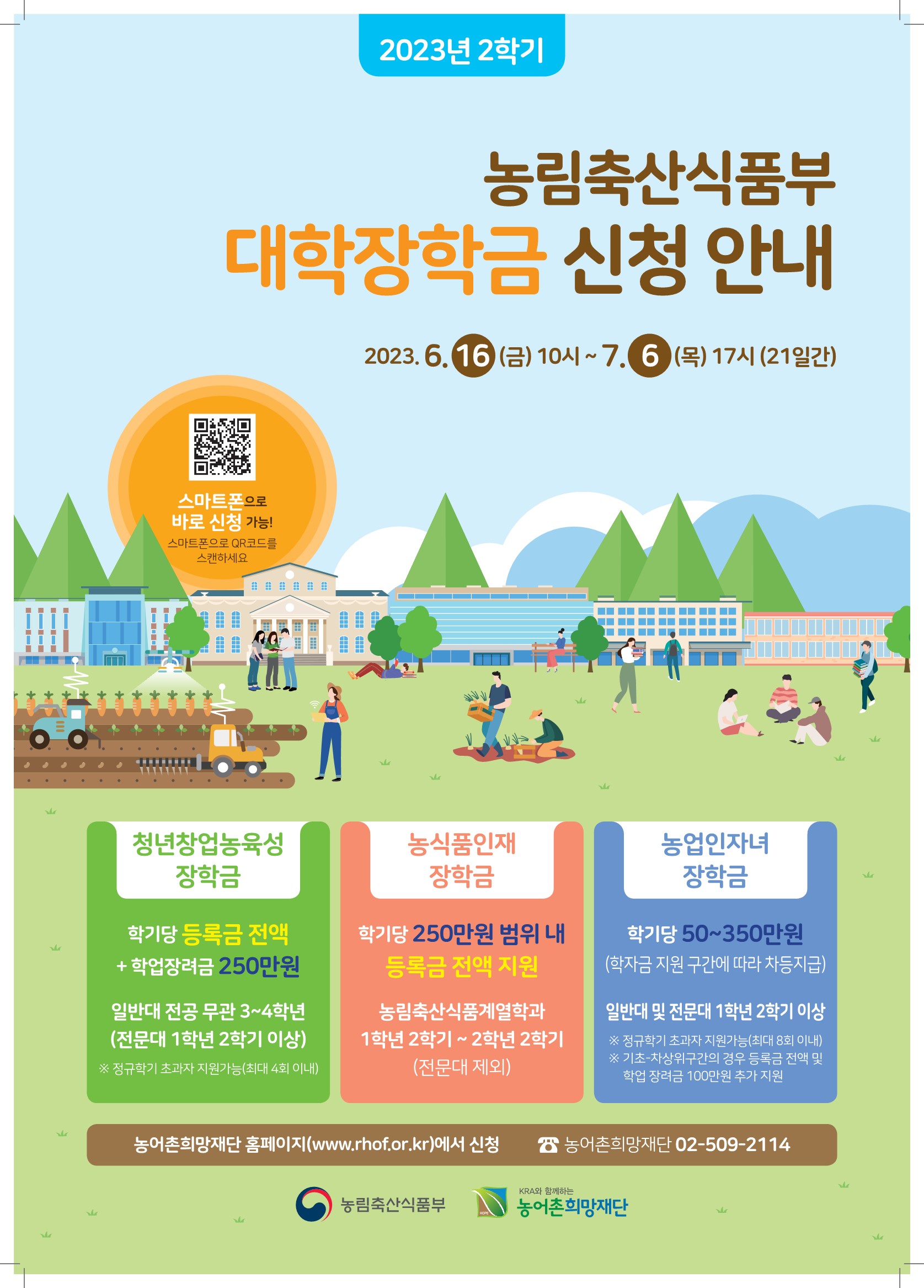 fnctId=bbs,fnctNo=145 농어촌희망재단-2023년 2학기 농림축산식품부 대학장학금 신청안내 작성일2023.06.09 수정일2023.06.14 작성자 한*정 조회수903 첨부파일 첨부파일이(가) 없습니다.