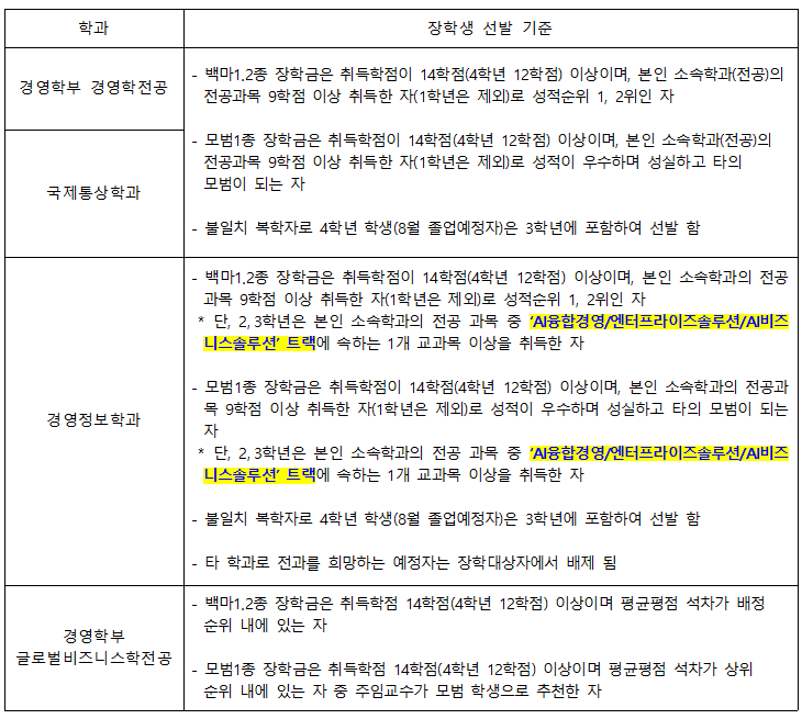 [경영대학] 경영대학 성적장학금 선발 기준 (2026. 3. 1.부터 적용)