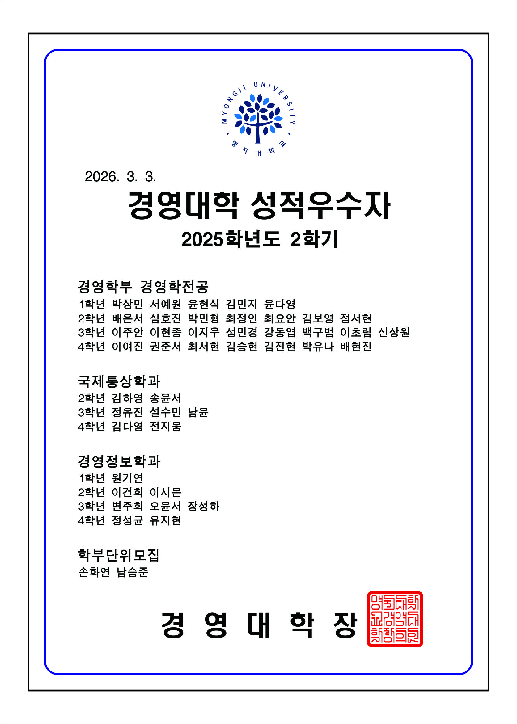 [경영대학] 2026-1학기 경영대학 성적우수자 시상 (기준:2025-2학기 취득성적)